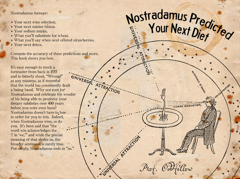 A final comment regarding the illustration of Nostradamus Predicted Your Next Diet. Once again, Mr. Conley has outdone himself in providing a plethora of remarkable images to amplify and support his text. They alone are worth the price of the book, in my opinion. My favorite of them appears on the final page and it depicts a Charles Dana Gibson style lady, seemingly thrown into a swoon by the conundrum of how best to prepare her next meal. I can relate; can't we all? —Natasha K.