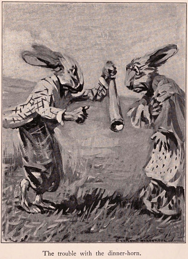 Trouble with the dinner horn.  From Dorothy's Rabbit Stories by Mary E. Calhoun and illustrated by E. Warde Blaisdell, 1907.