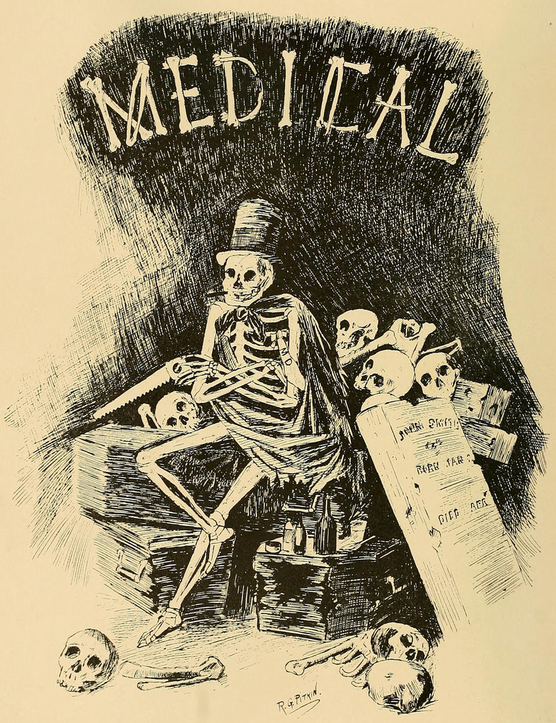 #vintage illustration #skeleton #skull #doctor #vintage yearbook #yearbook #alcohol #1900s #illustration #doctor death