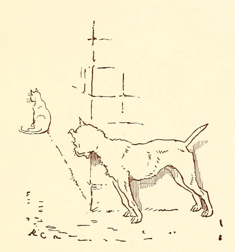 #vintage illustration #chased #rooster #illustration #dog and cat