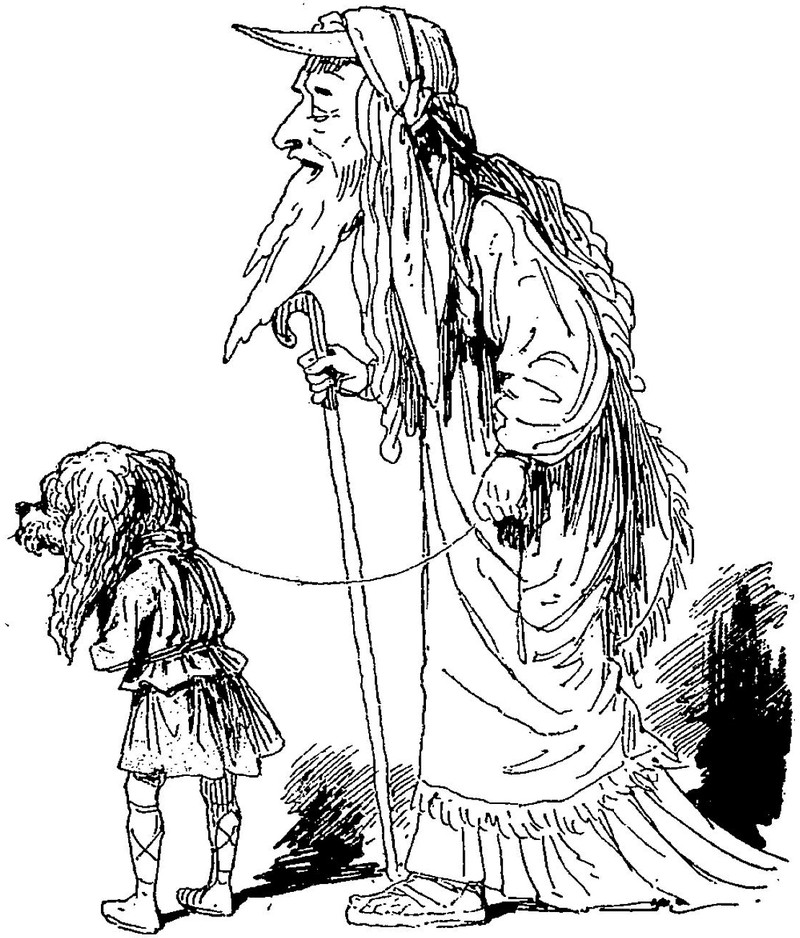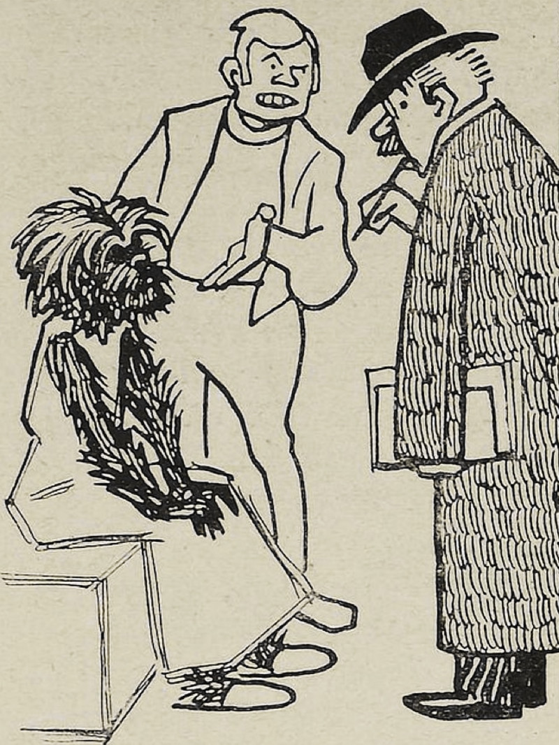 "Tell It to the Dog. The Traveler said, 'Glad enough to see you, pup,' and knelt and caressed the little animal with his big, gentle hand." From Cosmopolitan (1919).