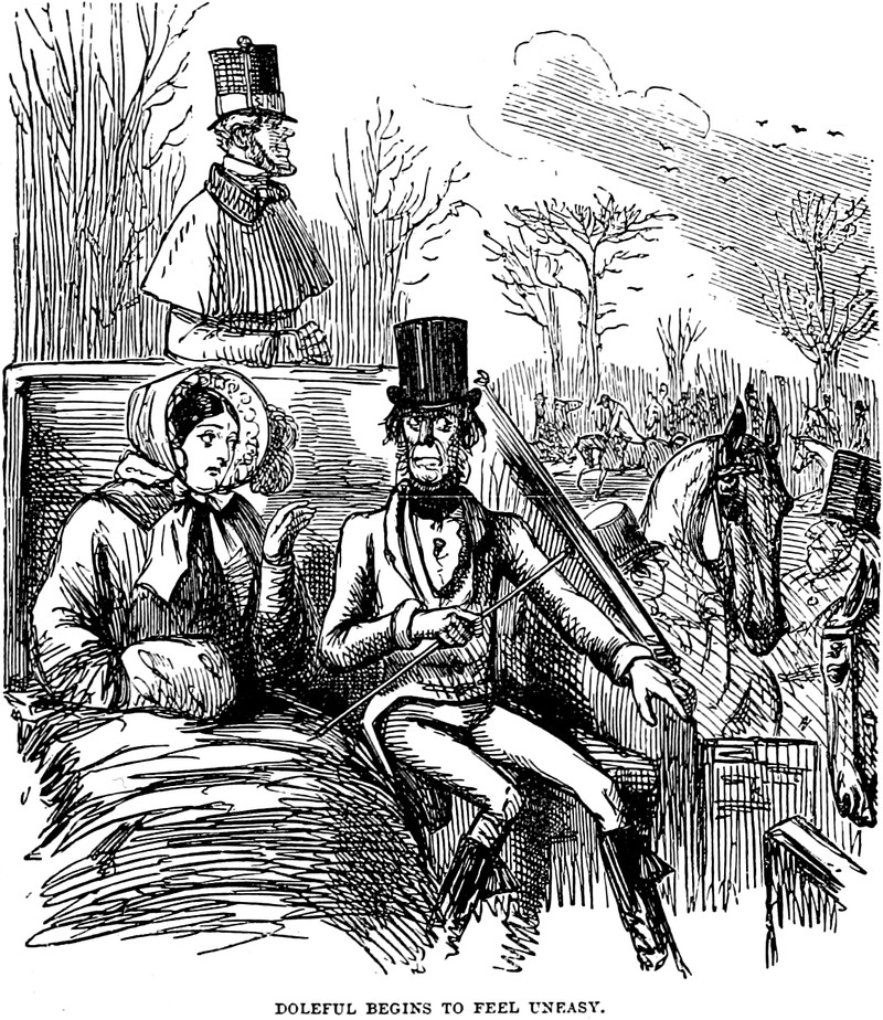 "Doleful begins to feel uneasy."  And Uneasy perhaps exclaims to Doleful, "Get your hand off me!"  From Handley Cross by Robert Smith Surtees, 1892.