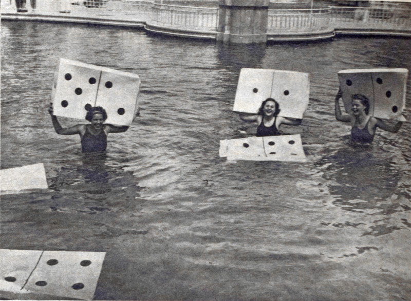 Water dominoes are played much like regular dominoes, though the rules are more fluid.  From Mocca, 1935.