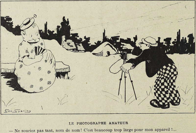 "Don't smile so much, what'syourname.  It's far too wide for my lens."  From Le Rire, 1913.