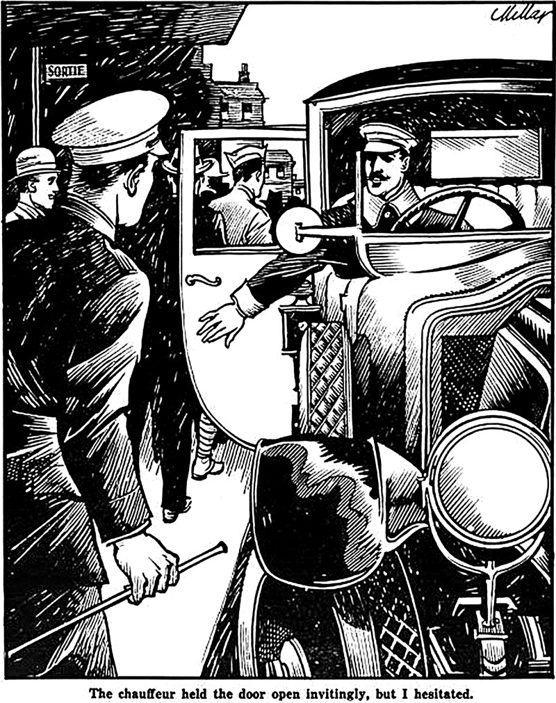 "The chauffeur held the door open invitingly, but I hesitated." Indeed, it's a good rule of thumb not to thumb rides from strange chauffeurs. From The Leatherneck, 1932.