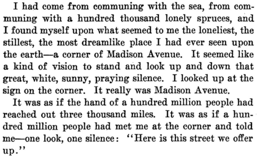 Here's a description of Madison Avenue as the stillest, most dreamlike place on earth, where the hand of one hundred million people reaches out three thousand miles and communicates through silent sign language.  We find this snippet in The Ghost in the White House: Some Suggestions as to How a Hundred Million People (Who are Supposed in a Vague, Helpless Way to Haunt the White House) Can Make Themselves Felt with a President, How They Can Back Him Up, Express Themselves to Him, be Expressed by Him, and Get What They Want by Gerald Stanley Lee, 1920.
