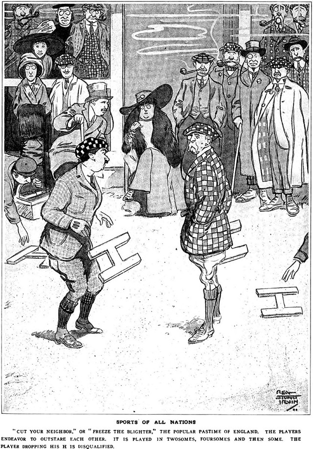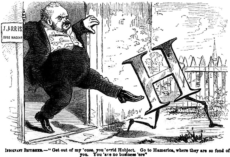 An illustration from an 1856 issue of Harper's magazine. The caption reads: "Indignant Britisher [J. Arris, Ouse Hagent]—'Get out of my 'ouse, you 'orrid Hobject. Go to Hamerica, where they are so fond of you. You 'ave no business 'ere.'"