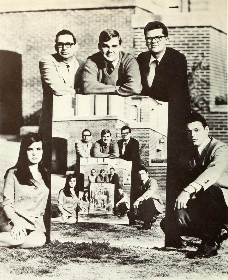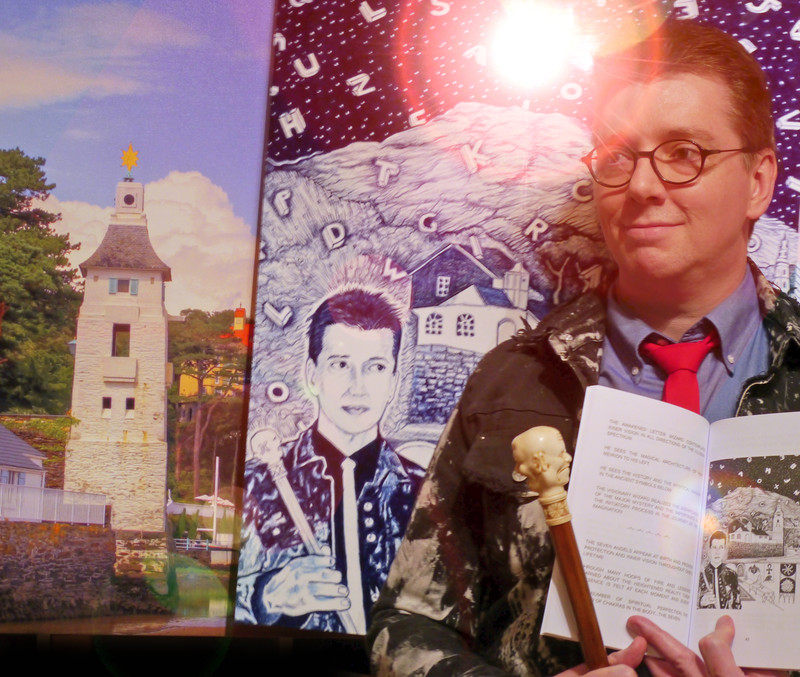 Here's our Droste effect of the day — Prof. Oddfellow holding his portrait in Jim Girouard's letter-dice divination book Journey Into Eternityand standing in front of a print of said portrait, itself in front of Oddfellow's photo of Portmeirion's camera obscura which features in the drawing.