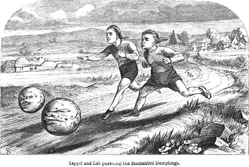 Pursuing the enchanted dumplings.  We've pursued enchanted dumplings, too.  From Holme Lee's Fairy Tales, 1869.