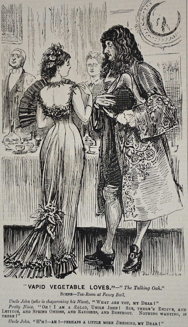 Here's a dress made of salad, from Punch, 1878. "See, there's endive, and lettuce, and spring onions, and radishes, and beetroot." Nothing wanting, except "perhaps a little more dressing, my dear!"