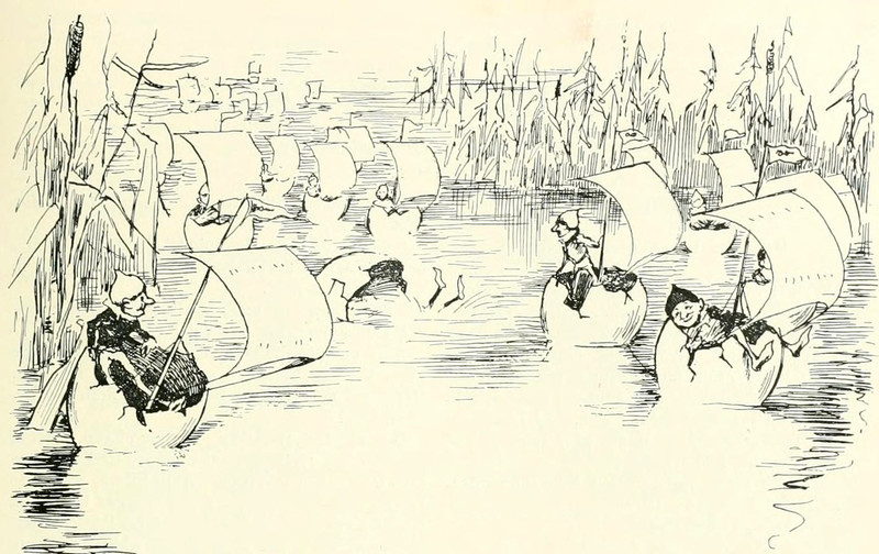 #vintage illustration #elves #vintage yearbook #yearbook #gnomes #eggshell #egg boat