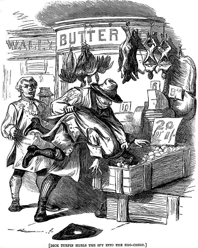 You've heard the idiom about having "egg on one's face," but here's how it used to happen.  From The Black Highwayman by Edward Viles, 1868.