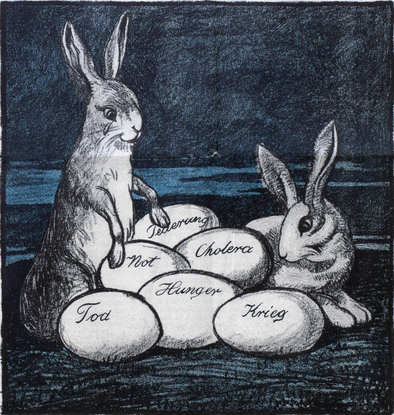 The Easter Bunny delivers the eggs of distress, disease, hunger, rising costs, war, and death. From Nebelspalter, 1916.