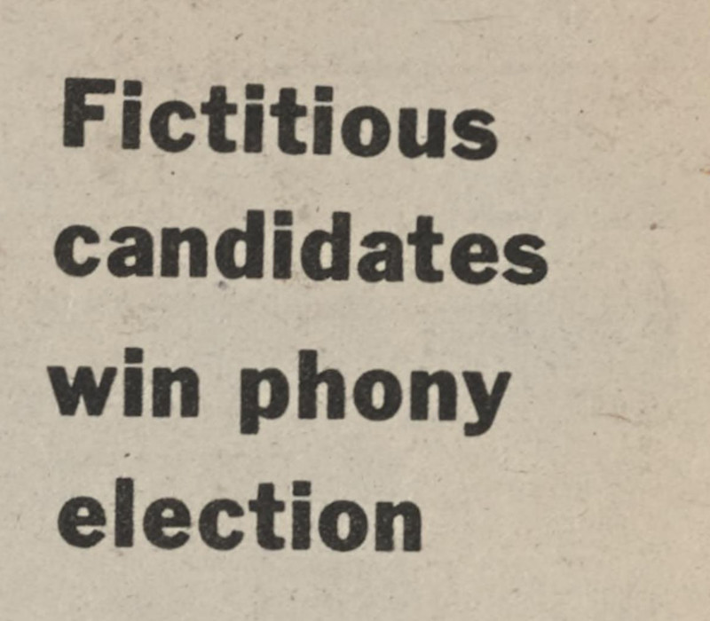 How true those words are, even today.  "Fictitious candidates win phony election."  From The Gateway, 1974.