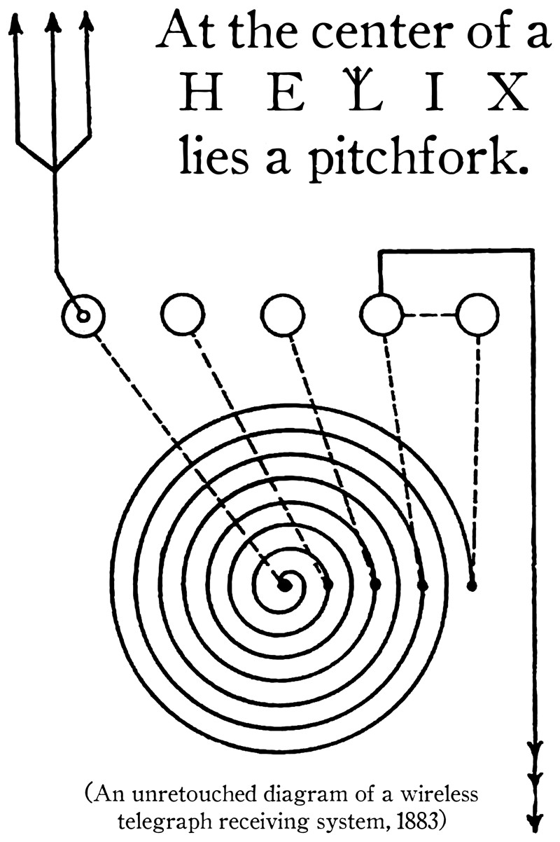 The text reads, "At the center of a helix lies a pitchfork.  (An unretouched diagram of a wireless telegraph receiving system, 1883.)"