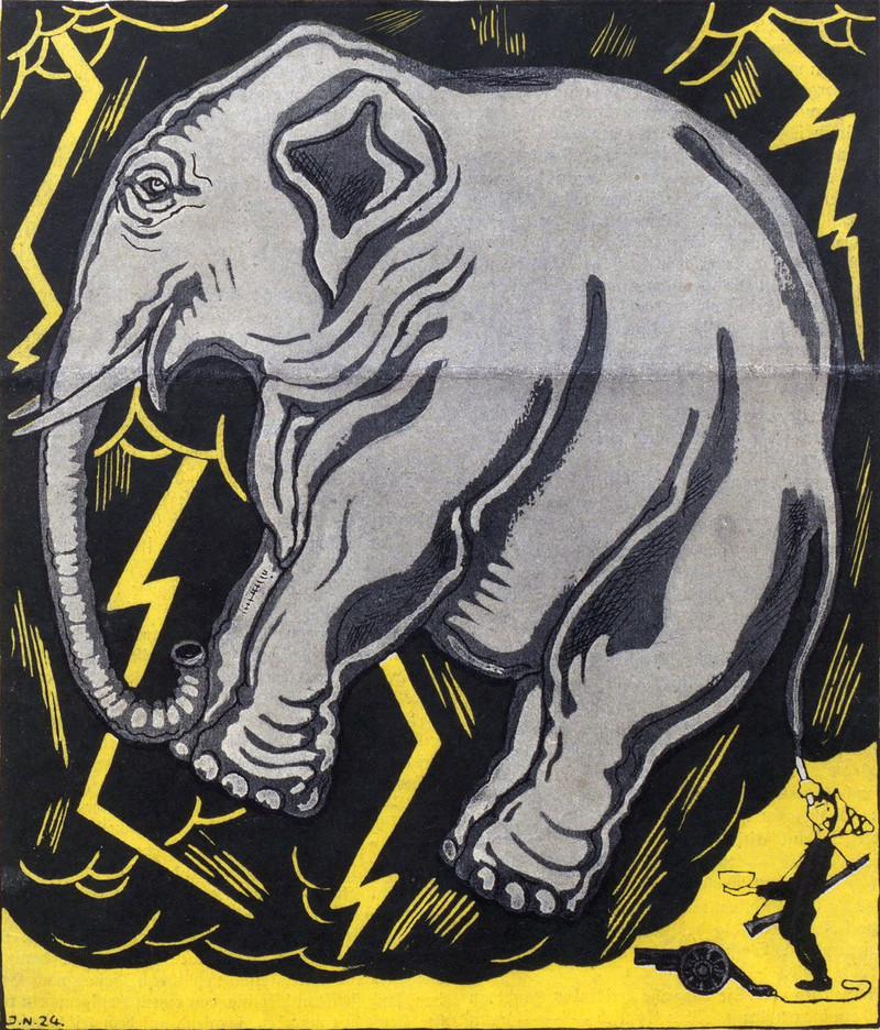 Inflating a giant elephant during an electrical storm is as dangerous today as it was in 1924.  From Nebelspalter, 1924.