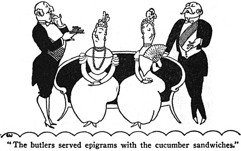 "The butlers served epigrams with the cucumber sandwiches."  From Of All Things! by Robert Benchley, 1921.