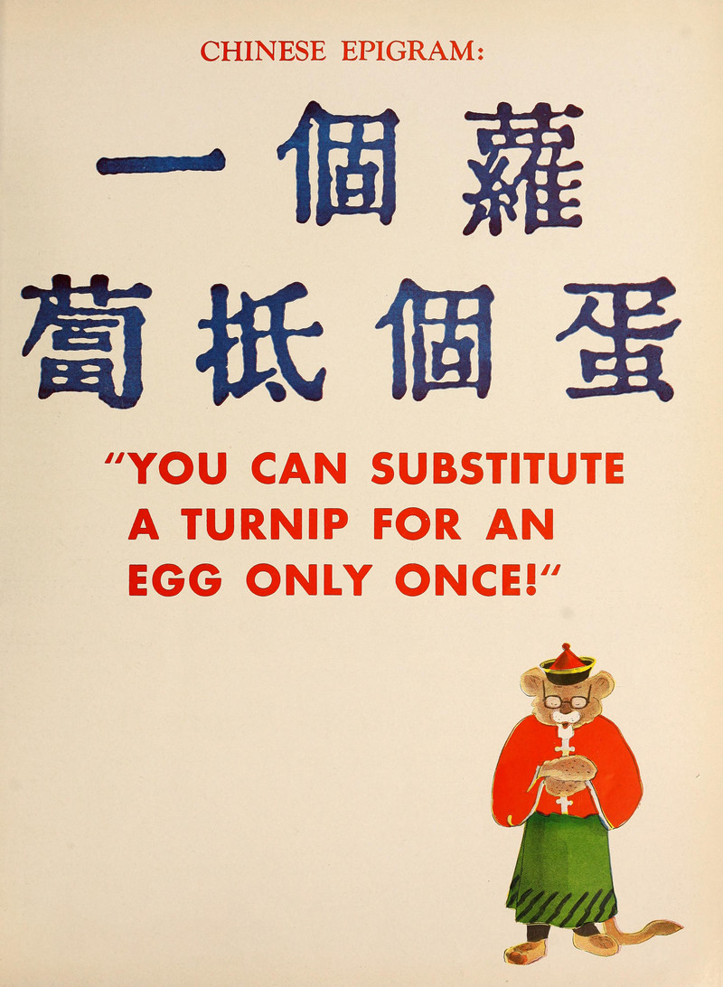 "Chinese epigram - 'You can substitute a turnip for an egg only once!'"  From The Film Daily, 1942.