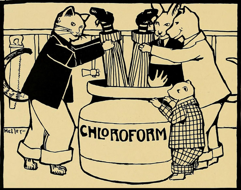 #vintage illustration #anthropomorphism #cat #animals #vintage yearbook #yearbook #tables turned #chloroform #euthanasia