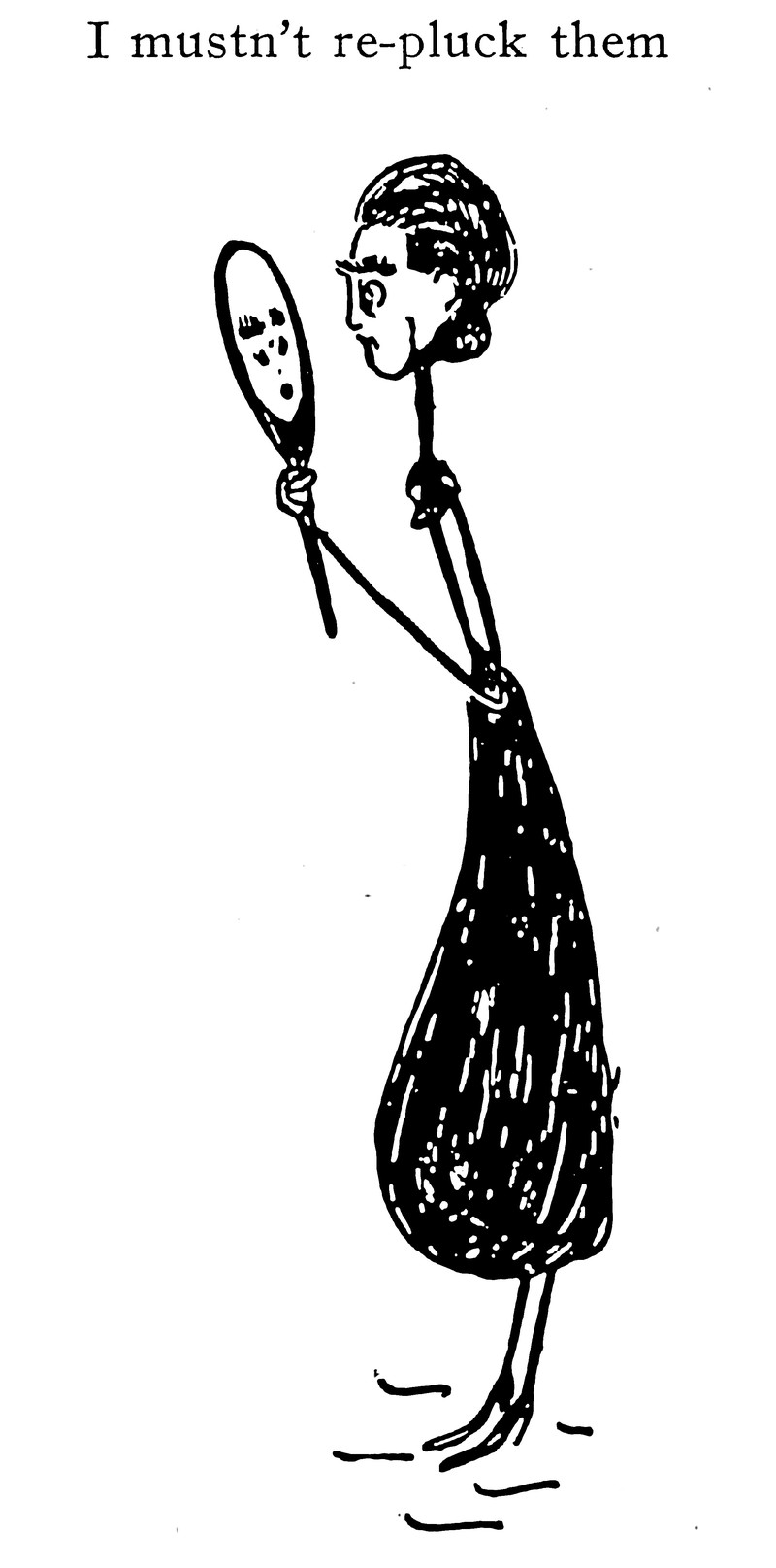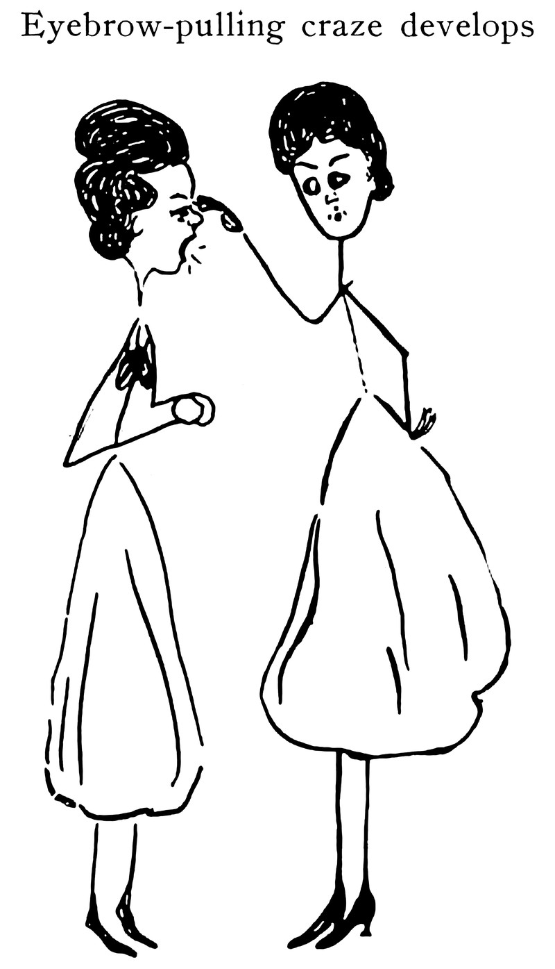 "Eyebrow-plucking craze develops."  From College of Industrial Arts' 1917 yearbook.