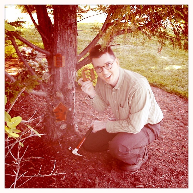Pictured above, Prof. Oddfellow knocks on a fairy door. Pictured below, Prof. Oddfellow reveals that even a fairy window floating in space may betray subtle sounds.