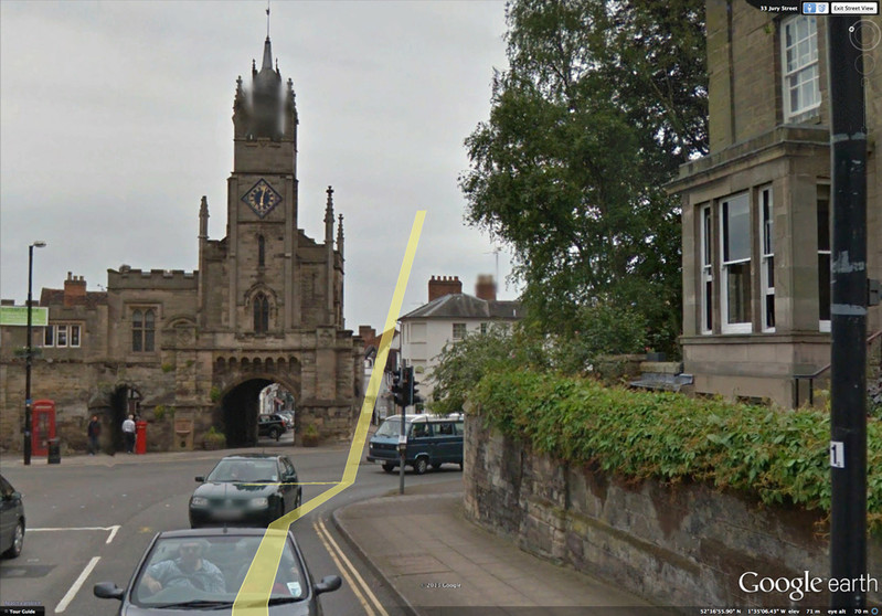 We can now reveal that giant, elaborate, even architectural clockwork has always been the engine that generates fairy tales, and our modern age of disenchantment is directly attributable to newfangled flat clocks and (horrors!) portable digital timepieces.  In a nutshell, one can't measure "once upon a time" by a microchip.  Begin contemplating where all the giant clocks are, (recalling that Germany's fabled Black Forest contains the vast majority of the world's largest cuckoo clocks), then contemplate the sources of your favorite fairy tales, and a bell will resound in your head.  Contemplate also why California's Disneyland is better than Florida's Magic Kingdom (recalling that the elaborate facade behind Disneyland's It's a Small World ride is an enormous, elaborate clock with animated figures emerging to mark the hours).  Now you'll have guessed the reason for our pilgrimage last year to the 14th-century fortified East Gate of the town of Warwick, still a working clock tower.  Google Earth imagery of the clock tower verifies that the spot violates the laws of space/time.  The top of the clock tower is revealed to be ethereal (see first and second pictures below).  It's an English version of a "Castle in Spain."  At least equally intriguing, an additional warp in space/time is verified: the yellow line that Google overlays to show the route of street traffic bends upward into space as it nears the clock tower.  This anomaly isn't a one-off but rather appears in multiple photos and angles (see pictures three and four below).  In our final picture, taken more recently by Google's spy cameras, note the optical illusion in the clock tower's windows.  We've paired it with an optical illusion by Gary Barwin, to clarify the exact phenomenon (see picture five below).  Windows begin as glass and end as stone, and vice versa.