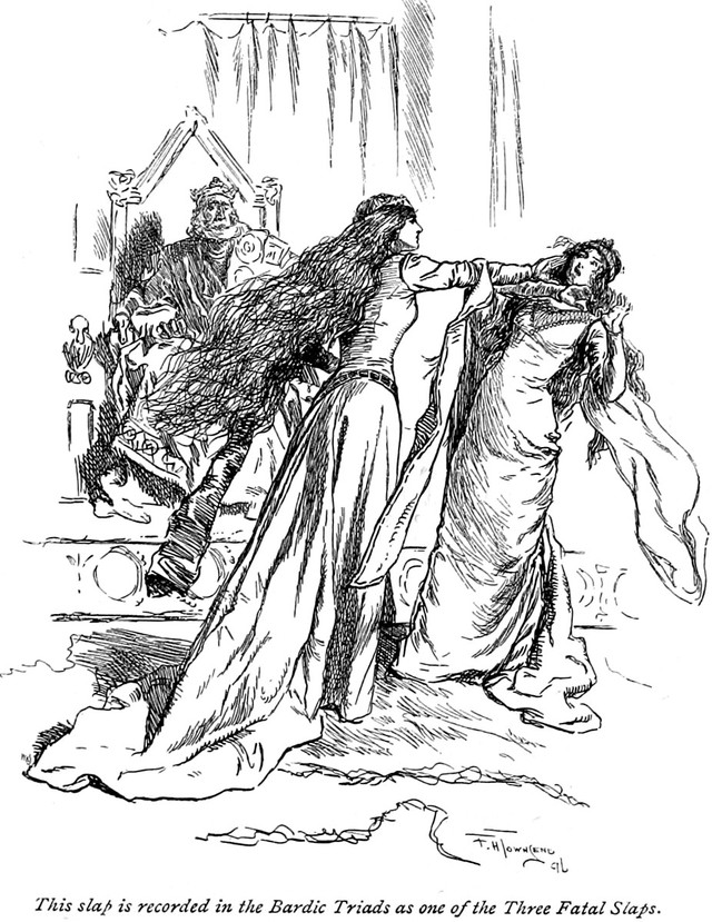 An illustration from The Misfortunes of Elphin and Rhododaphne by Thomas Love Peacock (1897).  The caption reads: "This slap is recorded in the Bardic Triads as one of the Three Fatal Slaps."