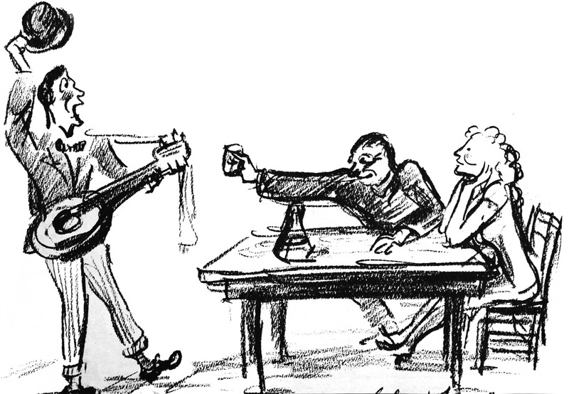 Here's a precursor to the "Gourmet Night" episode of Fawlty Towers, in which hapless Spanish waiter Manuel stalls for time when the duck entrée is extraordinarily late.  From Die Bühne, 1934.