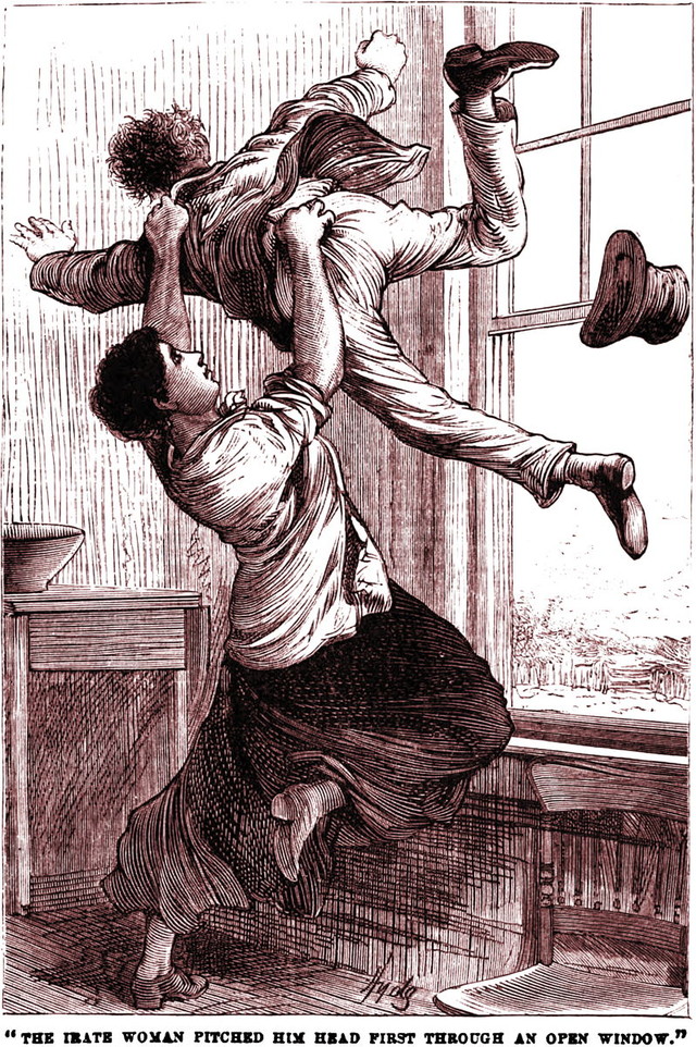 An illustration from an 1885 issue of Frank Leslie's Pleasant Hours magazine.  The caption reads: "The irate woman pitched him head first through an open window."