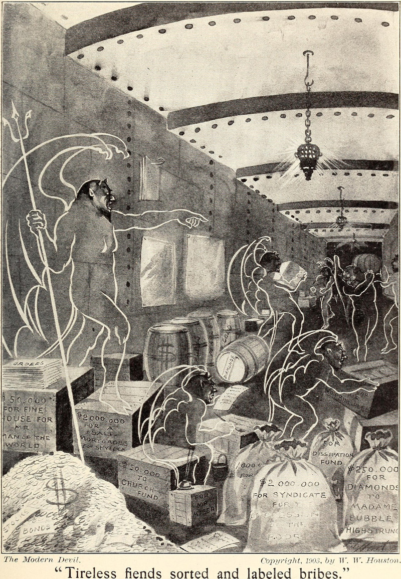 "Tireless fiends sorted and labeled bribes," from The Modern Devil by Isaiah Mench Chambers, 1903.Speaking of which, what exactly are a snowball's chances in hell? See A Snowball's Chance in Hell.