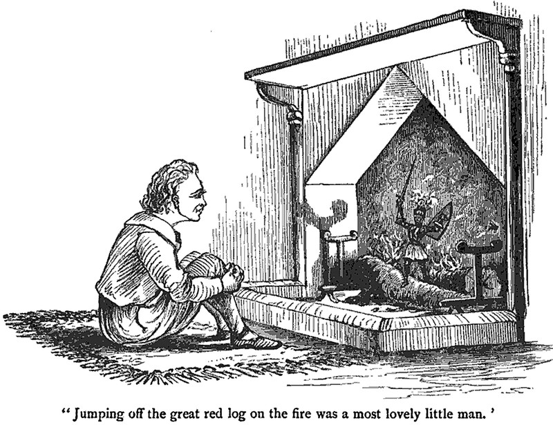 "Jumping off the great red log on the fire was a most lovely little man."  From Golden Curl by F. A. E. A., 1882.