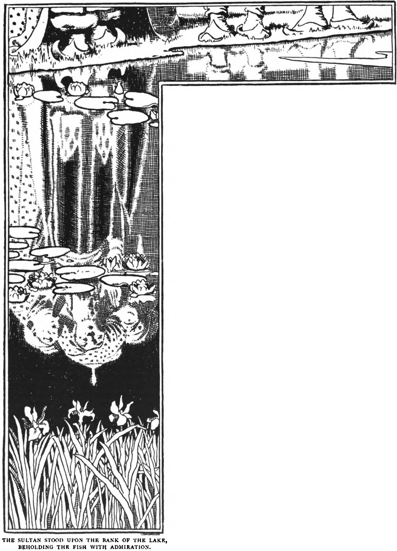 "The sultan stood upon the bank of the lake, beholding the fish with admiration."  From The Arabian Nights Entertainments, 1899.