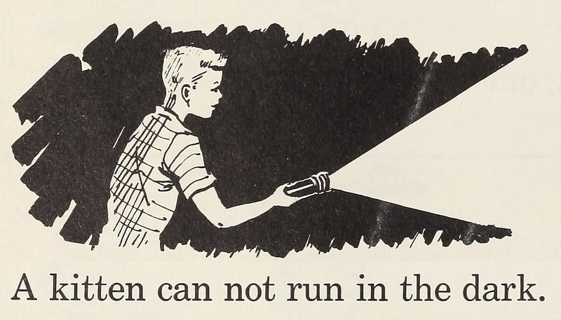 "A kitten cannot run in the dark."  From Practice for Up and Away by McKee, Harrison, McCowen & Lehr, 1957.
