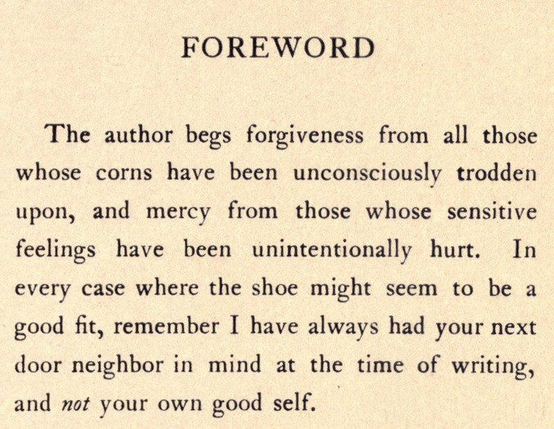 What a great pre-apology for causing offense: it's not you, it's your next-door neighbor the author was eviscerating. From Needles and Pins by Mina Deane Halsey, 1909.