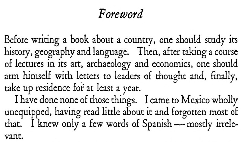 The author here admits to being wholly unqualified to write about Mexico, having spent little time there and having failed to study its history, geography, language, art, archaeology, philosophy, or economics. From Notes For A Book About Mexico by Howard Vincent O’Brien, 1937.