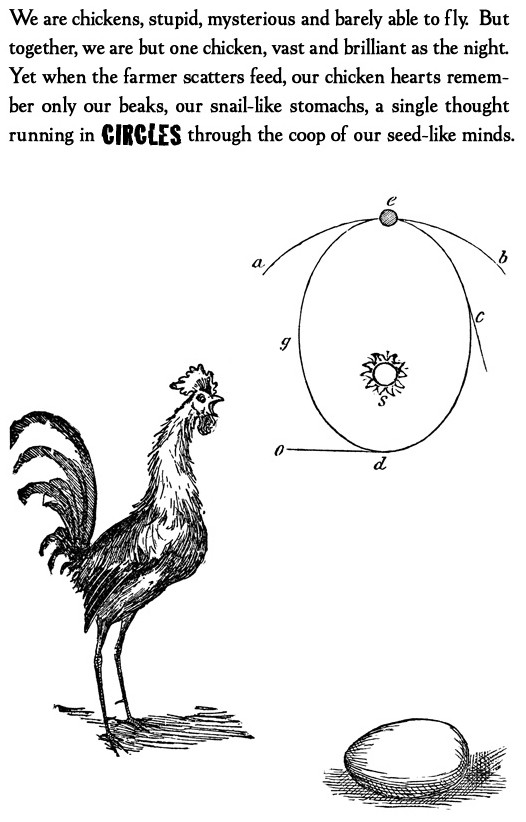 What higher commendation for a book of parables could there be?" This qualifies as a Retroactive Lifetime Goal. Here's a page from Franzlations, which symbolically shows that chickens' eggs are oblong in accordance with the earth's elliptical orbit around the sun. Chickens are famously linked to the sun, as the rooster announces each dawn.
