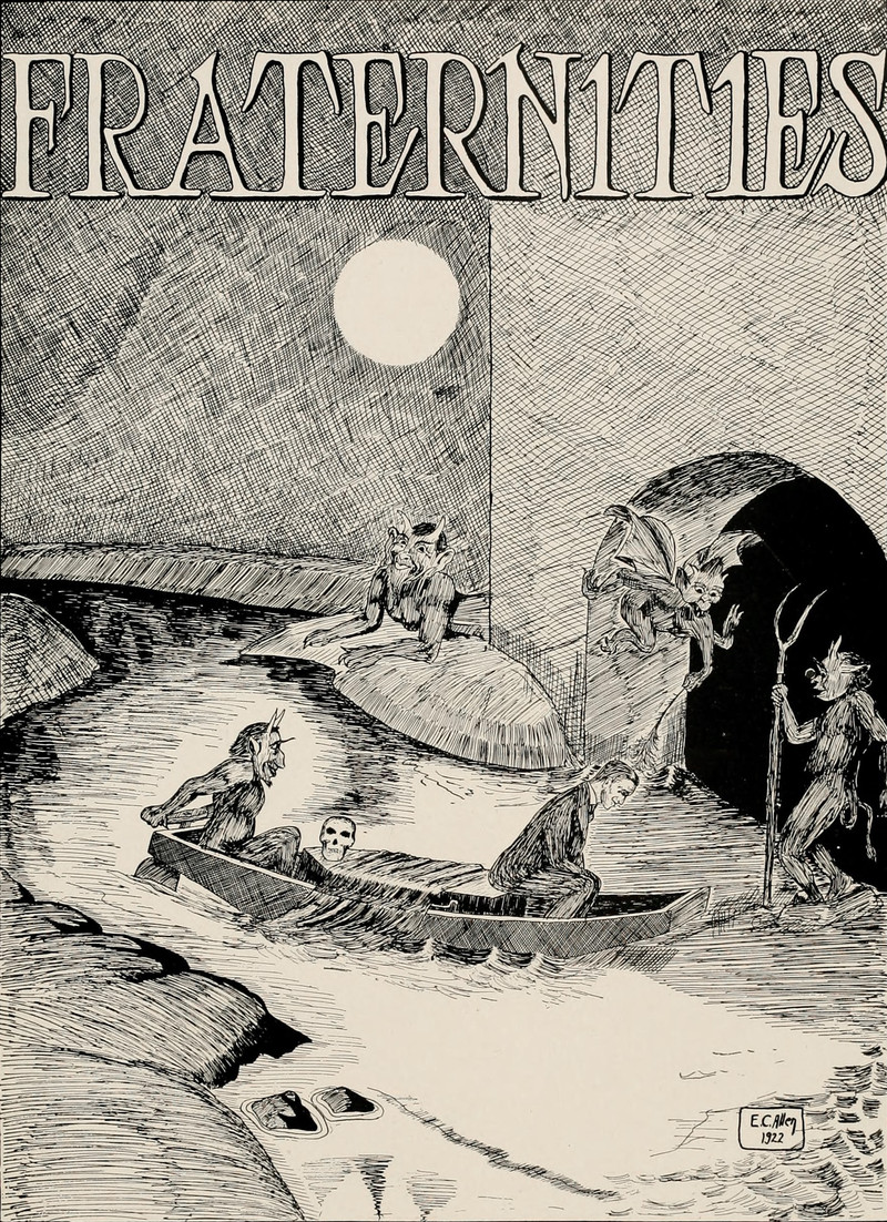 #vintage illustration #demon #hell #vintage yearbook #underworld #yearbook #fraternities #secret society #1920s #charon #styx #illustration