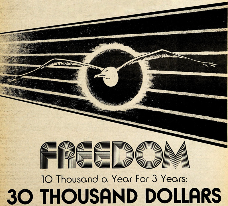 Freedom today costs "a buck o-five" ("Freedom Isn't Free" by Trey Parker), but in 1976 it cost ten thousand dollars over a three year period. Note that they did the math to show that 10 thousand times 3 equals 30 thousand. That's because this is from a college newspaper. Yes, we're throwing shade at innumeracy. We're in no mood to coddle willful ignorance. From the [DuPage] Courier, 1978.