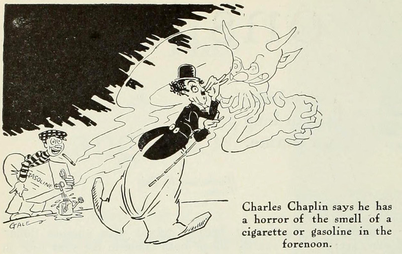 Here's a precursor to the line, "I love the smell of napalm in the morning" (Apocalypse Now). Charlie Chaplin had a horror of "the smell of gasoline in the forenoon." From Photoplay Magazine, 1920.