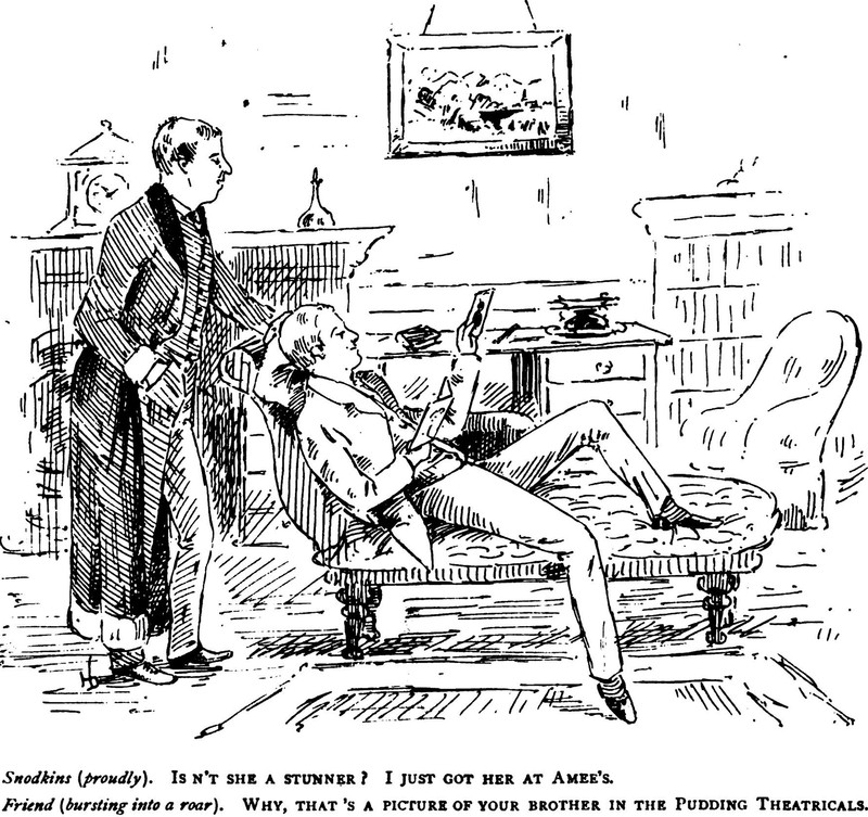 "Isn't she a stunner?"  "Why, that's a picture of your brother in the Pudding Theatricals!"  From The Harvard Lampoon, 1883.