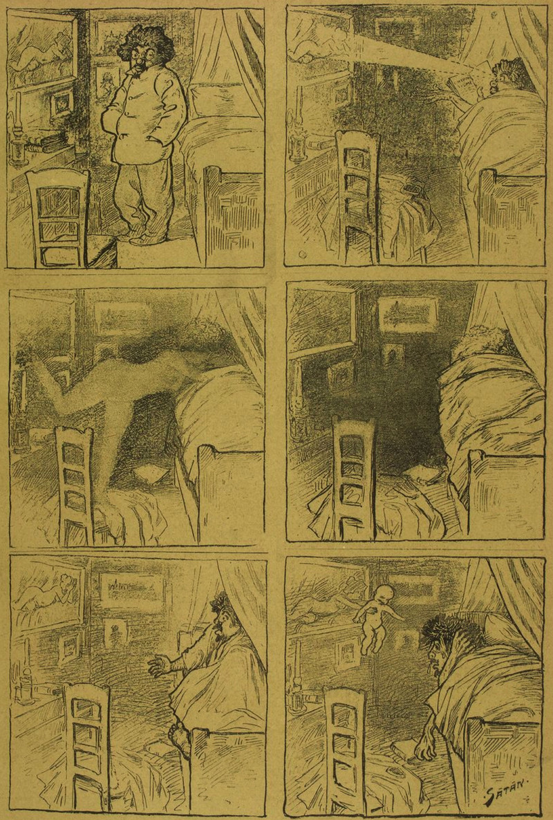 This is how, if you aren't careful about the artwork near your bed, you can end up with a family.  From L'Assiette au Beurre, 1901.