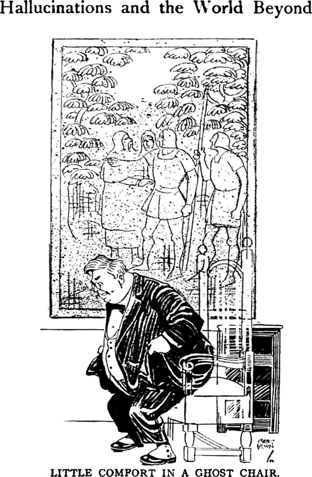 An illustration from a 1911 issue of Hampton's magazine.  The caption reads: "Hallucinations and the World Beyond: Little comfort in a ghost chair."