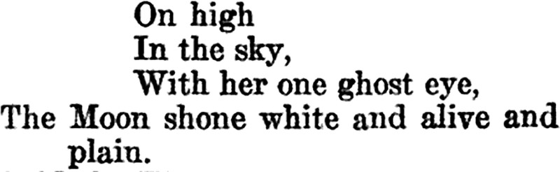 Here we learn that the moon has but a single eye, and it's ghostly. From "The Wind and the Moon" by George Macdonald, in One Thousand Poems for Children, 1920.