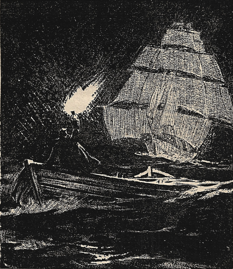 "Not a hundred yards from him was a sight he had never beheld in the wildest of his dreams—a ship rising without a sound out of the depths of the sea." From Wayside Tales, 1922.