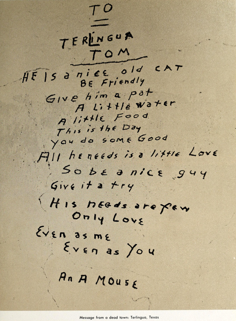 A message to a cat from the ghost town of Terlingua, Texas.  From the University of Texas at Arlington's 1974 yearbook.