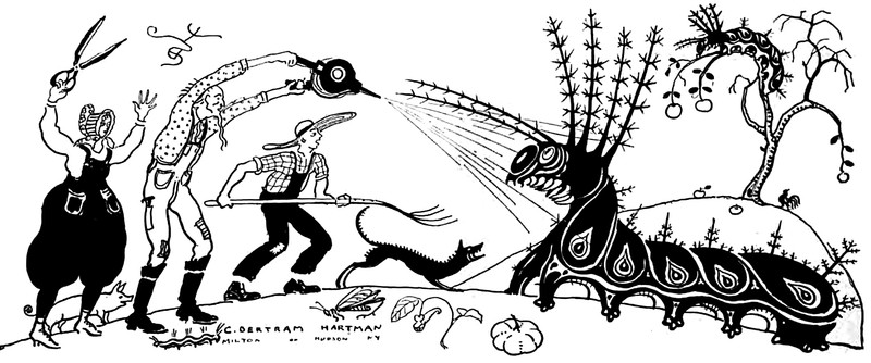 #vintage illustration #exterminator #bug killer #caterpillar #farmer #giant insect #pestilence #insect monster #pesticide #giant big