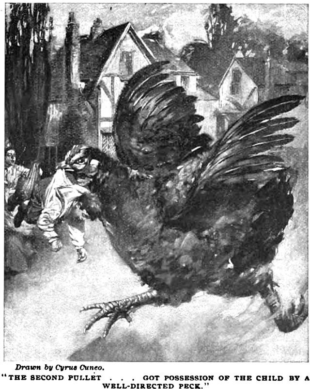 An illustration from a 1903 issue of Cosmopolitan magazine. The caption reads: "The second pullet got possession of the child by a well-directed peck."