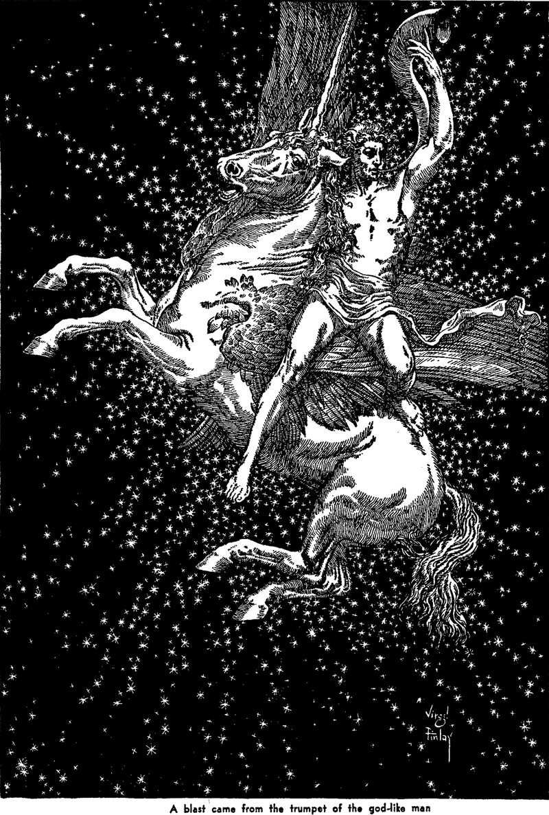 "A blast came from the trumpet of the god-like man."  From Fantastic Adventures, 1943.  See A Field Guide to Identifying Unicorns by Sound.