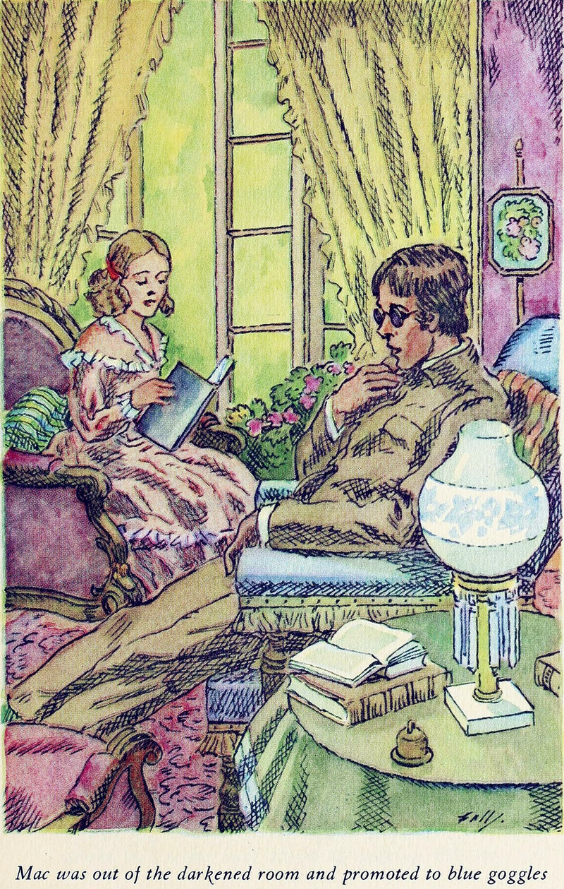 "Out of the darkened room and promoted to blue goggles."  From Eight Cousins by Louisa M. Alcott and illustrated by Mary Lamberton Becker, 1948.