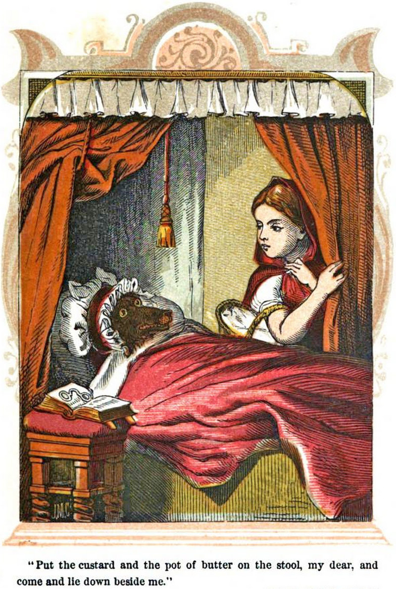 "Put the custard and the pot of butter on the stool, my dear, and come and lie down beside me."  From Favourite Fairy Tales, 1861.